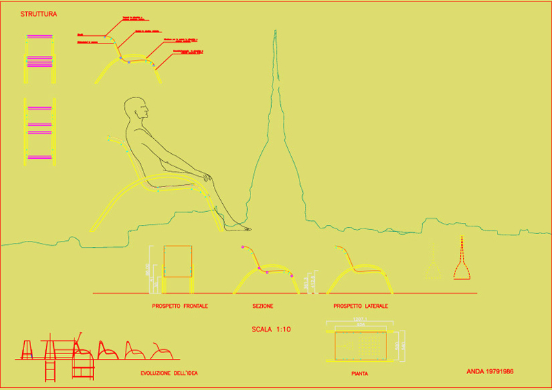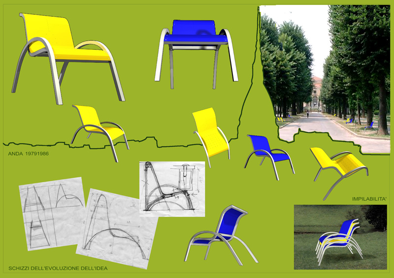 The project presented responds to the needs of the city of Turin to realise a seat which would give an image to the civic park as an object of historic value in the synthesis of its lines but in absolutely contemporary form. The idea was conceived as an evolution of the seats for relaxation of the 18 and 1900s. The choice necessitates a certain enlarging of the object, compensated for by the lightness of the materials used and by its essential lines. The need expressed in the competition for ecologically compatible materials has resulted in the use of recyclable plastic for the seat while the back is in semi-finished aluminium. The techniques used have been determined by the criteria of low cost and simplicity of mass production: the seat and the backrest have been created by bending a sheet of polyethylene 4 mm thick in yellow and blue (the colours of the city of Turin). The ergonomics of a seat designed for relaxation require a depth of 45 cm, a length of 50 cm and the height of the backrest to be 85 cm. The proposed seat, thanks to the lightness of the materials used and the ease of stacking, correspond to the characteristics imposed by the competition.