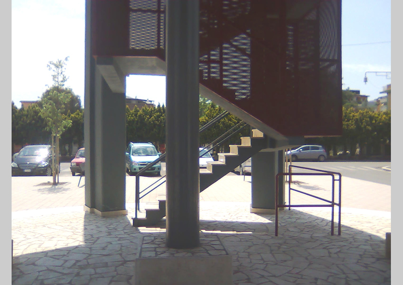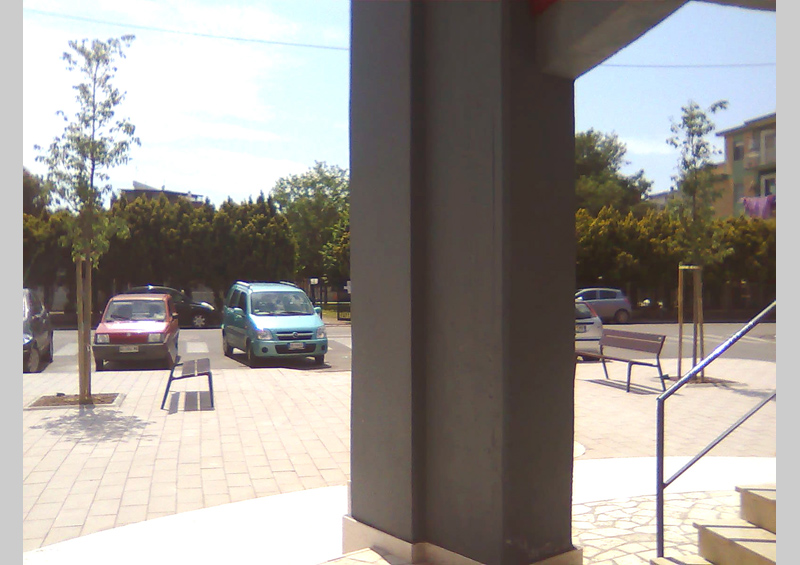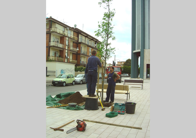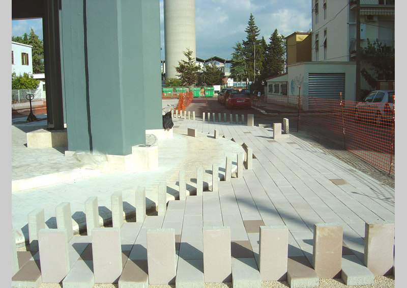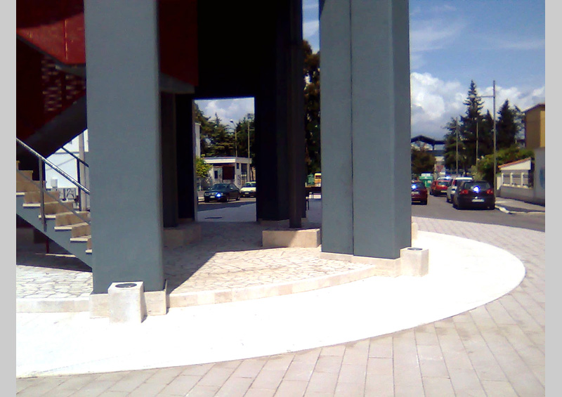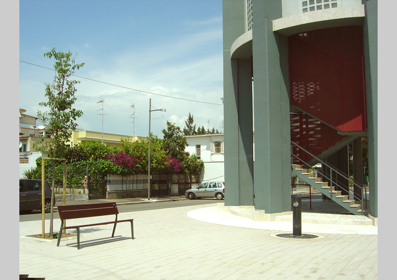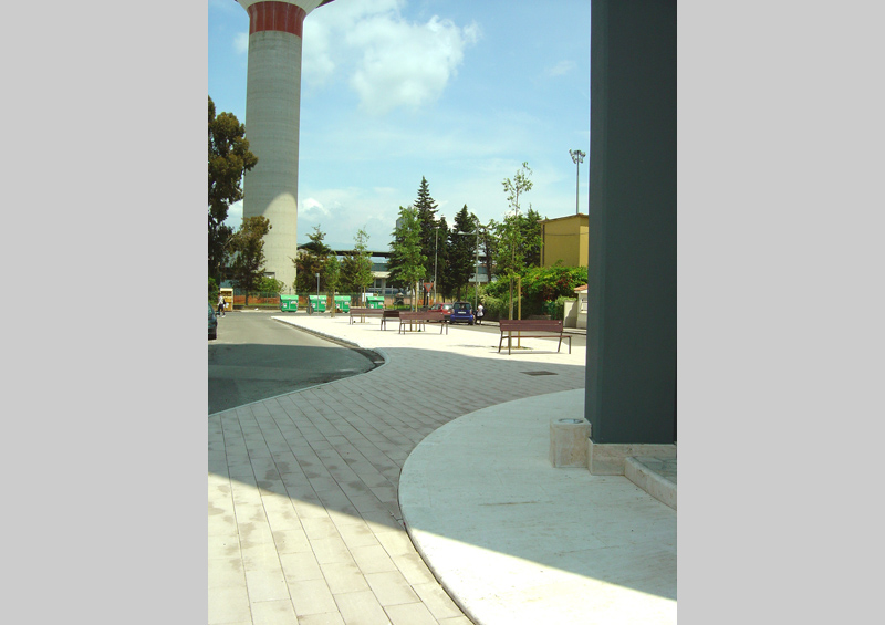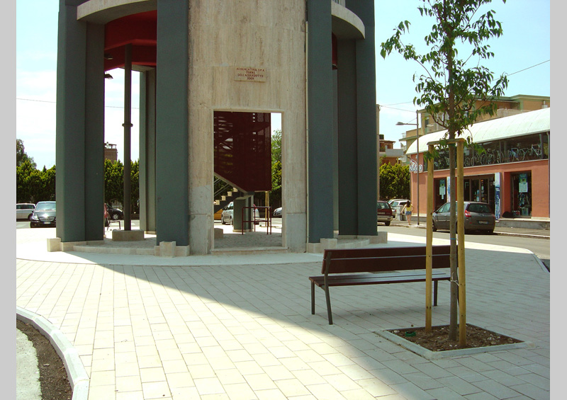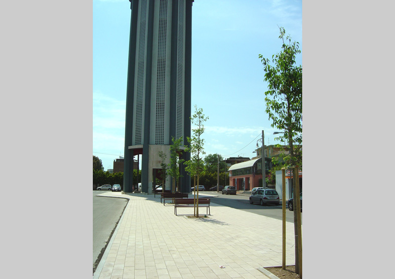 The pedestrian area with bollards made of ballast opens around the tower into a lager space in front of the school. It measures approximately 600 square metres and is decorated with four examples of Celtis australis in the first area and the second consists of a small square facing the school. The entire space is illuminated by eight street lamps positioned on the pavements on both sides of the square.